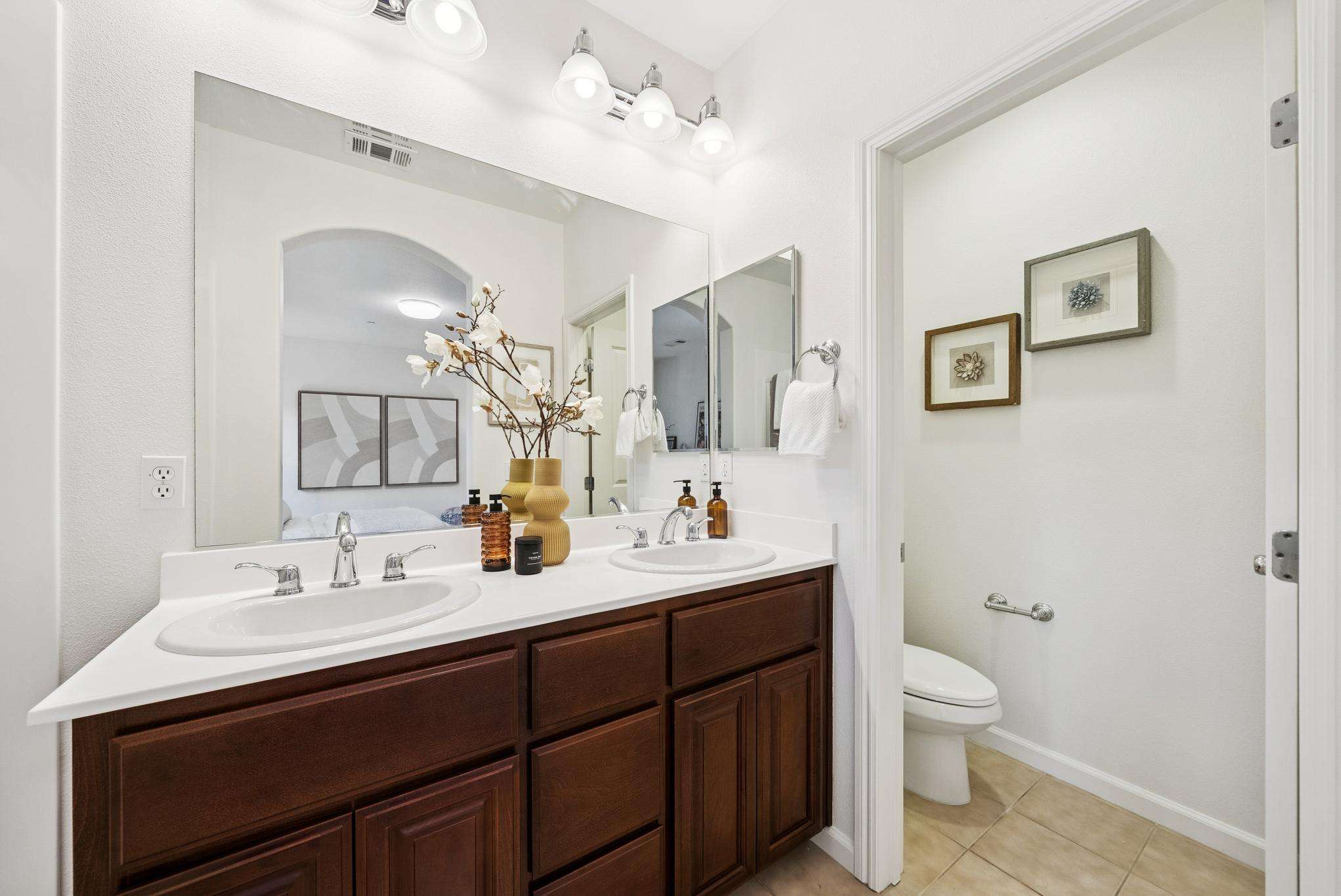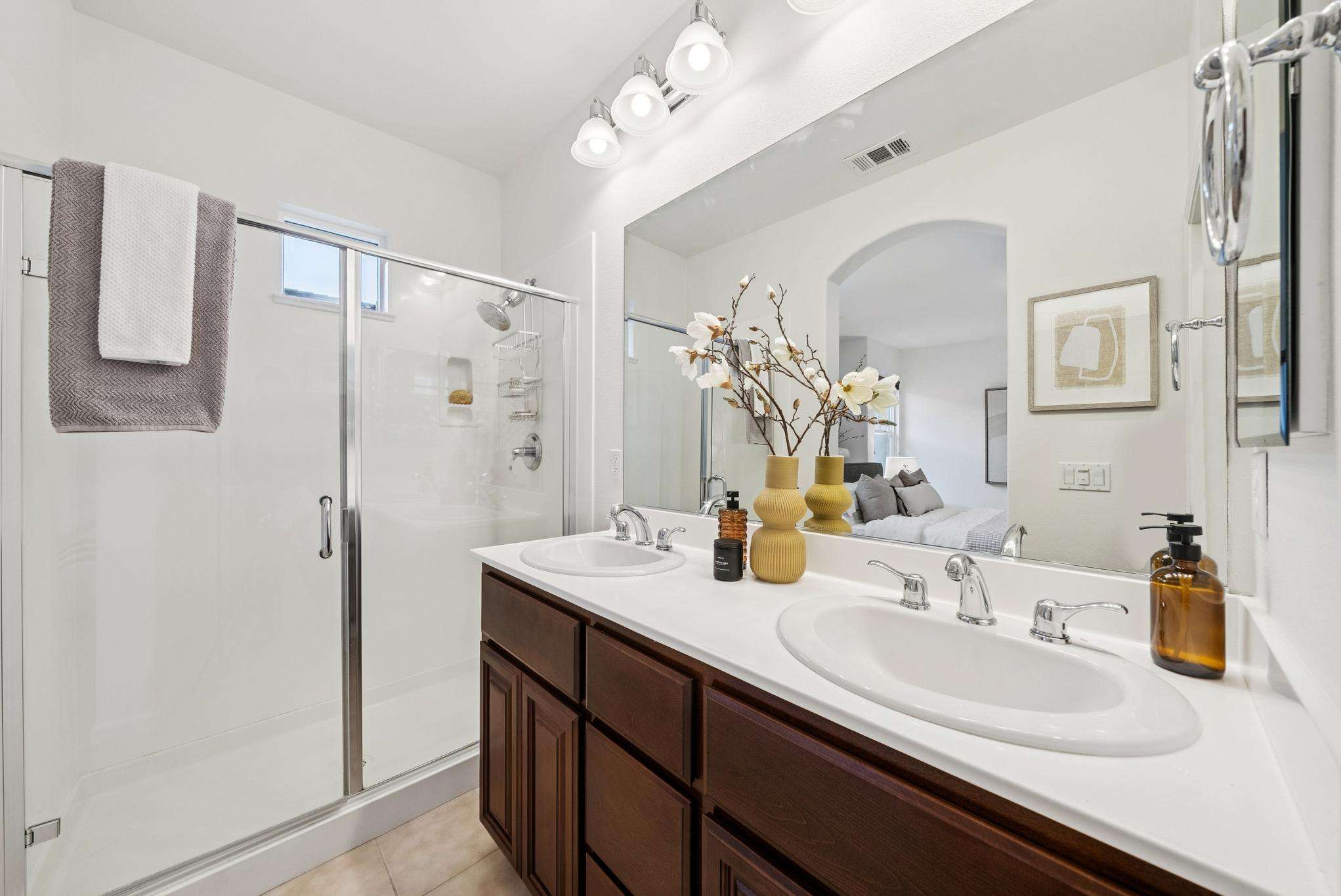 - Primary suite: walk-in closet; spa bath with double sinks, large glass-enclosed shower, tiled floor, private toilet area